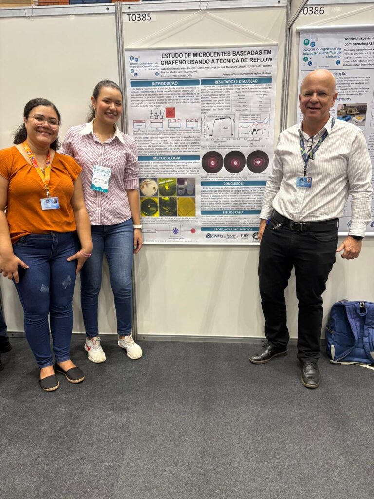 Entre os destaques, a Isabella B. Santos Silva, aluna de Iniciação Científica da Faculdade de Engenharia Elétrica e de Computação (FEEC/Unicamp), apresentou o trabalho “Estudo de Microlentes Baseadas em Grafeno Usando a Técnica de Reflow”. O projeto, relacionado à atividade A5.1, foi orientado pelo professor José Alexandre Diniz, pesquisador associado ao NAMITEC, e coorientado pela doutoranda Jacilene M. Medeiros. A bolsa de Iniciação Científica da estudante foi concedida pelo NAMITEC.