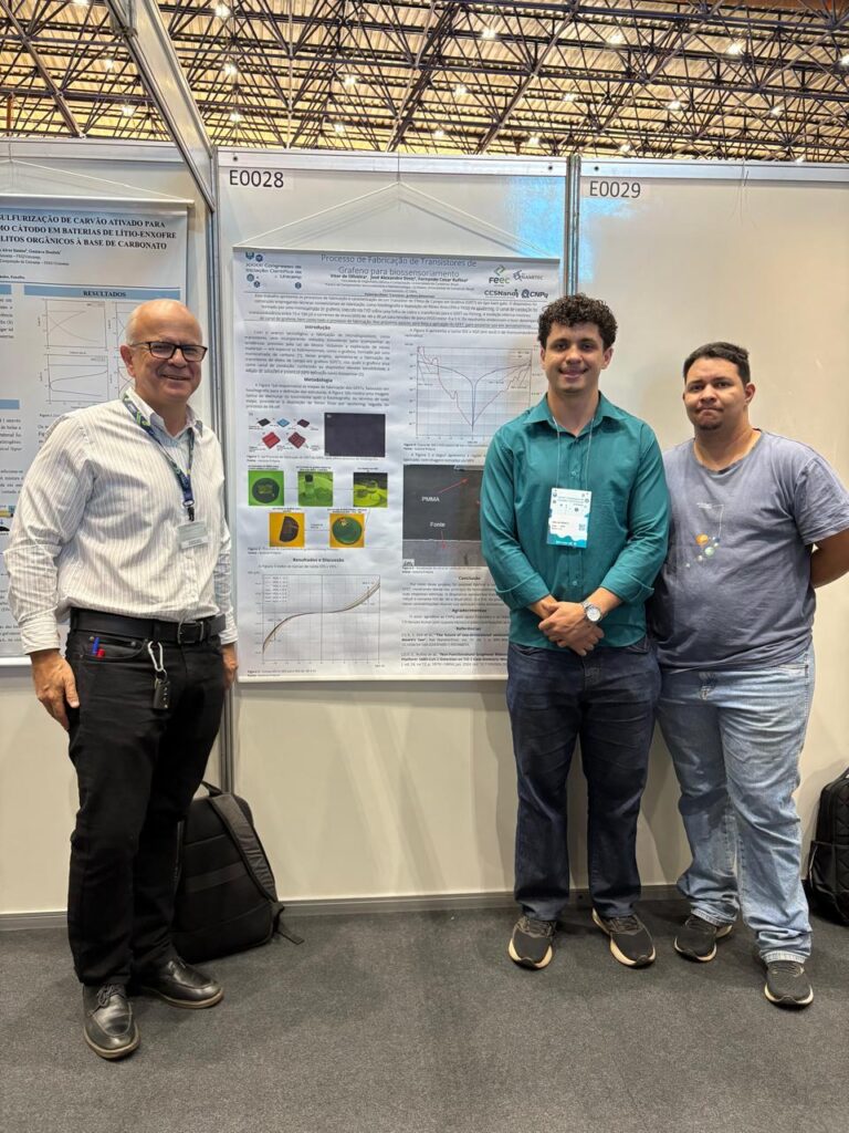 Outro projeto de IC financiado pelo NAMITEC é o de Vitor de Oliveira, também aluno da FEEC/Unicamp, que apresentou o trabalho “Processo de Fabricação de Transistores de Grafeno para Biosensoriamento”. O estudo, relacionado à atividade A4.3, é orientado pelo professor José Alexandre Diniz e coorientado pelo Dr. Fernando Rufino, com foco no desenvolvimento de dispositivos baseados em grafeno aplicados à detecção biomolecular.