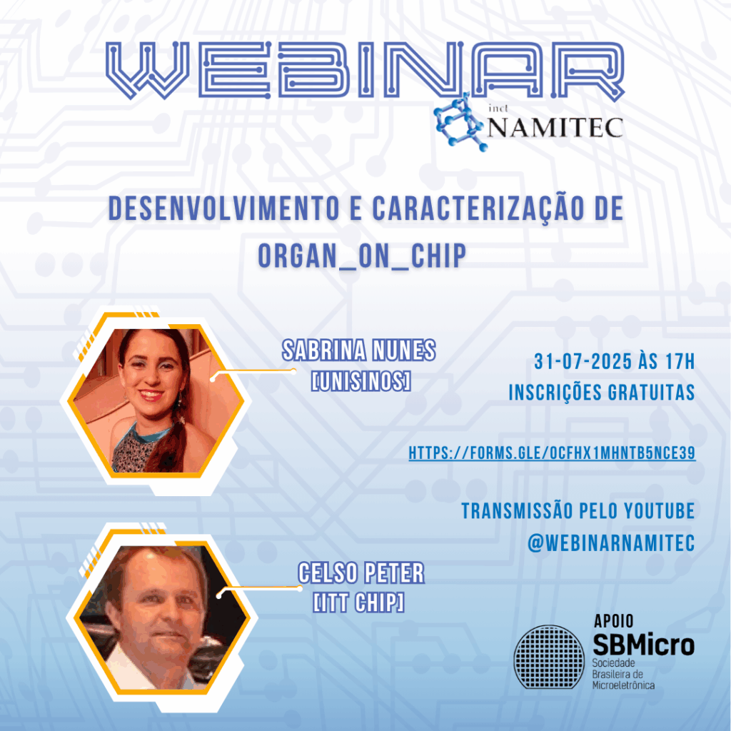 O NAMITEC tem o prazer de convidar a comunidade acadêmica e científica para o IV Webinar do NAMITEC de 2025, que ocorrerá no dia 31 de julho, às 17h, com a palestra Desenvolvimento e Caracterização de Organ_on_Chip, apresentada pela Profa. Dra. Sabrina Esperança Nunes (Unisinos) e o Engo. Celso Peter (itt Chip).